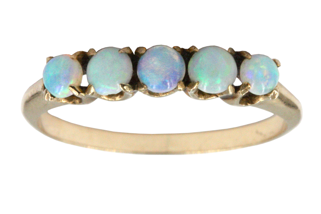 A simple Victorian 5-stone opal cabochon ring made in 10k gold. Opals are in wonderful condition and exhibit hues of green, blue, and pink.